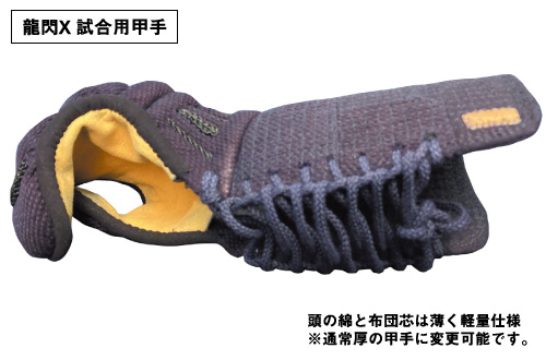 甲手頭、布団共に極限まで芯材を薄くし、軽さと素手感覚にこだわった試合専用の甲手 超軽量:1組約400g ※稽古では使用しないでください |